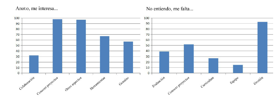 El análisis de los portfolios realizados por los participantes a lo largo de las jornadas ha permitido obtener una imagen de su percepción sobre distintos aspectos del ABP, que se han cuantificado por categorías (Fig. 3), destacando el interés de conocer proyectos, herramientas, y la contextualización real del aprendizaje (Genuino) de los ABP y las dificultades en la Gestión.