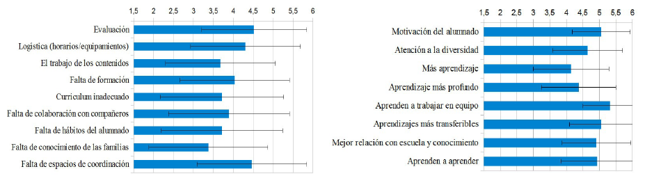El profesorado participante destaca, en los portfolios y encuestas, como valores positivos de la metodología ABP que mejora la motivación y el compromiso personal, y la autonomía (aun así, sólo en 26 de los proyectos presentados el alumnado participa de manera significativa en la planificación, y ninguno de los 4 perfiles identificados lo hace). Los resultados ponen de manifiesto una importante preocupación en relación a cómo evaluar a los alumnos. Existe un conflicto entre la evaluación del grupo y la individual, ya que efectivamente es complicado tener una visión individualizada del aprendizaje a partir de productos colectivos, y también entre la evaluación del proceso o del producto final. A algunos profesores también les preocupa organizar el centro o poder cumplir el currículum trabajando siempre por proyectos, esto se detecta tanto en los portfolios como en la encuesta. Sin embargo, algunas experiencias muestran que sí es posible trabajar mediante proyectos la totalidad del currículo y que las objeciones a estas metodologías por razones de tiempo no tienen fundamento (Domènech-Casal 2017c, Trujillo 2016).