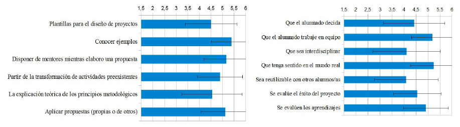 El desarrollo de las habilidades de trabajo en equipo es el aspecto que más destaca el profesorado como fortaleza del ABP (Fig. 4b). Observando las desviaciones tipo se detecta que el profesorado detecta de forma distinta las dificultades del ABP, pero es más homogéneo en la detección de sus fortalezas. El profesorado considera que son elementos de calidad de una propuesta ABP que se evalúen los aprendizajes, que tenga sentido en el mundo real y que se trabaje en equipo (Fig. 5a).