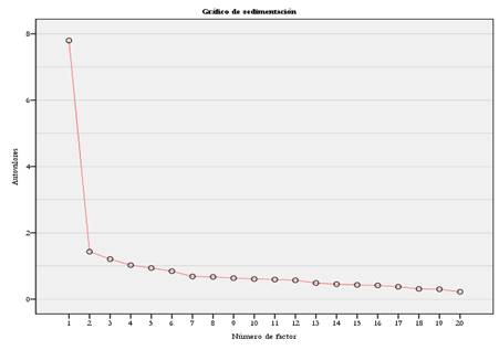 La ejecución del AFE arrojó una solución factorial compuesta por cuatro factores, correspondiéndose con las cuatro dimensiones establecidas en el SSAQ y explicando el 46.65% de la varianza (D1: 36.60%; D2: 4.73%; D3: 3.13%; D4: 2.19%). Estos fueron retenidos según el criterio de Kaiser (autovalores superiores a 1) y conforme a la pendiente del gráfico de sedimentación (Cattell, 1966) (Figura 1).