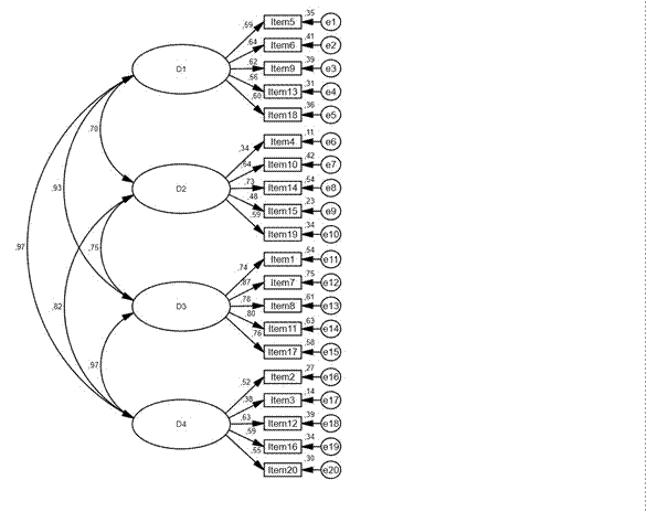 El ajuste del modelo teórico del SSAQ, compuesto por cuatro variables latentes (dimensiones) medidas por cinco variables observables (ítems) cada una, se muestra en la Tabla 5.