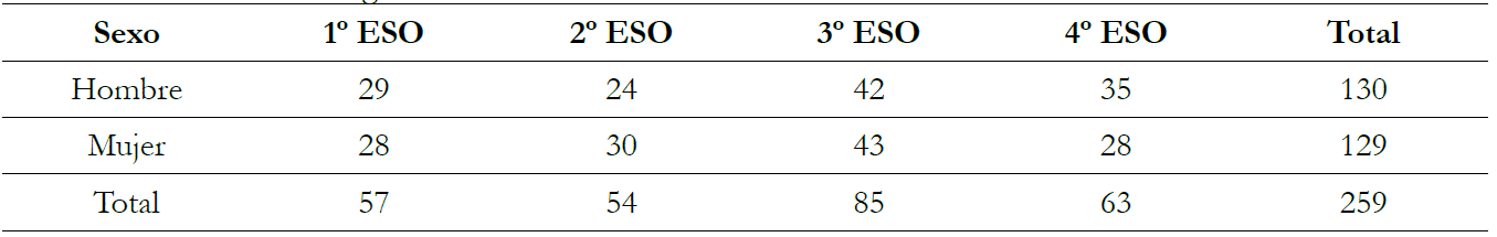 La muestra la conforman 259 estudiantes de ESO, la selección de estos se realizó mediante muestreo no probabilístico intencional por razones de accesibilidad. La conveniencia de la muestra radicó en la participación del centro educativo en un proyecto de investigación e innovación en colaboración con la Universidad de Granada (a través de los autores de este trabajo). Los datos proceden del alumnado matriculado en los cursos de 1º a 4º de ESO en un instituto del sur de Córdoba (España), participando un total de 130 alumnos y 129 alumnas (Tabla 1). A excepción de 25 de cuarto curso, que cursaban los itinerarios de Ciencias Sociales y Humanidades, el resto cursaban asignaturas de ciencias.