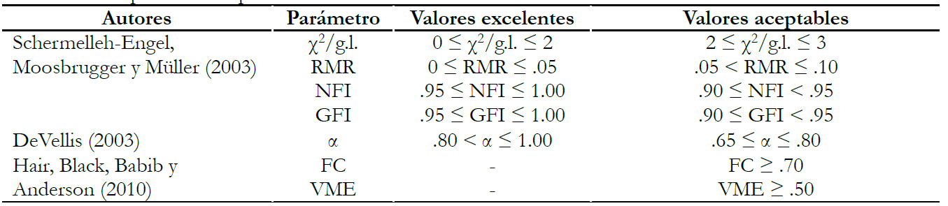 Finalmente, el AFC se ejecutó según el procedimiento sugerido por Kline (2005): (1) especificación del modelo; (2) identificación; (3) estimación de parámetros; y (4) evaluación del ajuste. La evaluación del ajuste del modelo estructural propuesto en el SSAQ se realizó a partir de los índices de ajuste proporcionados conforme al método ULS: (1) χ2/g.l. (grados de libertad); (2) el índice gamma (GFI); (3) el residuo cuadrático medio estandarizado (RMR); y (4) el índice normado de ajuste (NFI). Además, la fiabilidad se evalúo a partir del alfa de Cronbach (α) y la fiabilidad compuesta (FC) junto con la varianza media extraída (VME), calculados para cada dimensión. La interpretación de todos estos parámetros se realizó conforme a las pautas mostradas en la Tabla 2.