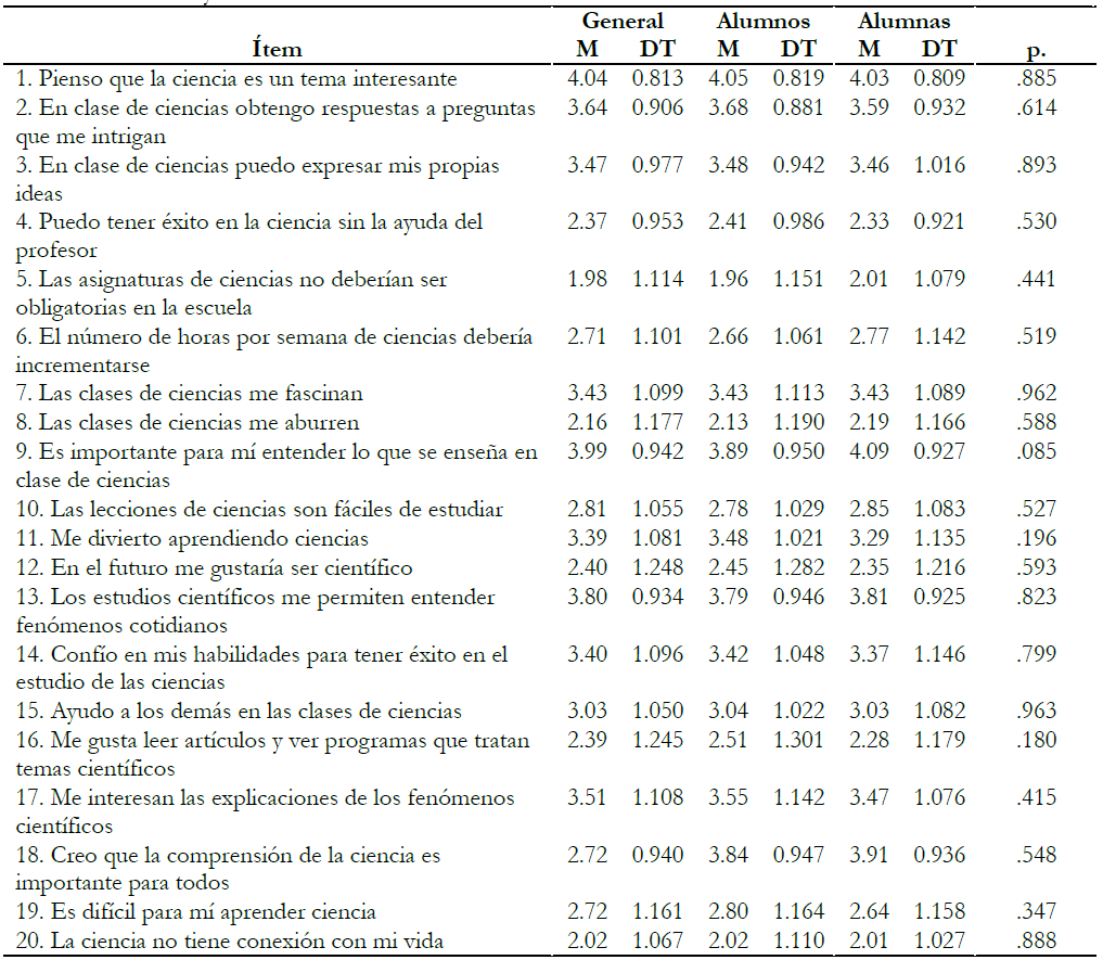 El análisis pormenorizado, ítem a ítem, nos permite afirmar que el alumnado considera importante la ciencia escolar y disfruta con su aprendizaje. Además, parece existir cierta cohesión entre los resultados. A modo de ejemplo podemos observar los resultados de los ítems 5 y 18, estos muestran cómo el alumnado es consciente de la importancia de una formación básica en ciencias para toda la ciudadanía y que ello parte de cursar asignaturas de ciencias en los niveles educativos obligatorios. A pesar de esto, la dispersión de los resultados es amplia, dado que todos los ítems evidencian una desviación típica próxima o superior a uno. No obstante, de los resultados mostrados en la Tabla 3, aquellos obtenidos en los ítems 4, 12 y 16 podrían ser los más relevantes. Así, parece generalizado entre el alumnado que fuera del contexto escolar (ítem 16) o al término de los niveles educativos obligatorios (ítem 12) su relación e interés por la ciencia podría descender.