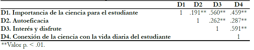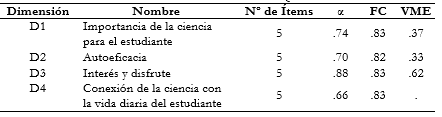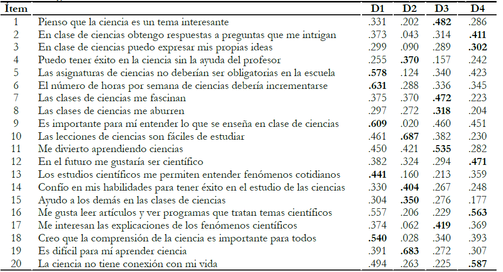 Conexión de la ciencia con la vida diaria del estudiante (D4): considera la utilidad de la ciencia percibida por el alumnado y sus deseos de realizar estudios superiores relacionados con esta, reflejándose todo ello en la vinculación de las ciencias con la vida cotidiana de aquel. Por ende, puntuar alto en este factor se interpreta como una vinculación estrecha de las ciencias con la vida diaria del estudiante (ítems: 2, 3, 12, 16, 20*).
