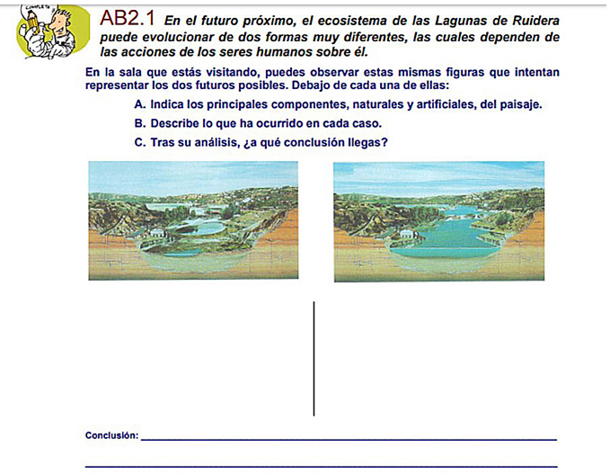 En relación con la dimensión “Didáctica”, en lo que respecta al nivel de procesamiento cognitivo que exigen las actividades, se evidenció que la mayoría de los museos no presentaban actividades (48%), lo cual demostró que el potencial de ofrecer estos recursos para personas que no tienen la posibilidad de ir al museo físico no es totalmente aprovechado. En aquellos sitios que sí poseían actividades, éstas se caracterizaron por apuntar a la memorización y reproducción, mientras que sólo un 15% requirió explorar e indagar. Una de éstas se ejemplifica en la actividad de la Figura 4, en la cual se presentaba al usuario un ecosistema que frente a las acciones antropogénicas podía avanzar hacia dos escenarios distintos. Esta actividad exigía indicar, describir y analizar, conduciendo a la exploración e indagación. Según la RNC (2000), la indagación es central para el aprendizaje de las ciencias, ya que los estudiantes describen objetos y fenómenos, elaboran interrogantes, construyen explicaciones, las sitúan en relación con lo que se sabe del conocimiento científico, y comunican sus ideas a otros. Los alumnos identifican sus hipótesis, utilizan el pensamiento crítico y lógico, y consideran explicaciones alternativas. De esta manera, desarrollan activamente su comprensión de la ciencia al combinar el conocimiento científico con las habilidades de razonamiento y pensamiento. Esto manifiesta la importancia de la elección del museo por parte de los docentes para que estos recursos tecnológicos propicien la construcción del conocimiento sobre ciencias.