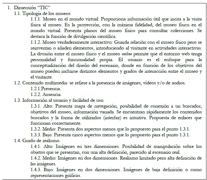 En la Tabla 1 se detalla el instrumento de análisis de los museos virtuales de ciencias con las dimensiones, categorías y subcategorías correspondientes.