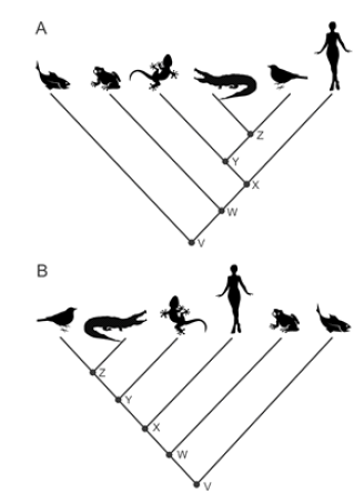 Si bien los árboles filogenéticos muestran las relaciones entre los taxa (terminales) a partir de los ancestros hipotéticos (nodos), existe una tendencia generalizada a no prestar atención al árbol como un todo. Este hecho se ve agravado por la forma de representar los árboles filogenéticos, con los terminales alineados (ya sea de derecha a izquierda o de arriba a abajo) y generalmente, con cierto orden que ubica a un taxón preferido (el considerado por el imaginario popular como el más avanzado) en el extremo derecho o abajo (e.g. humano, Fig. 1A). Algunos errores asociados a este problema son: (1) Considerar más emparentados terminales que están más cerca en el gráfico, en lugar de observar los nodos compartidos por ellos. En la Figura 1A, es erróneo suponer que el gecko está más emparentado con el cocodrilo que con el ave dado que en la ilustración se encuentra al lado del primero y a dos lugares del segundo. La correcta interpretación es que el gecko está igualmente relacionado con ambos dado que comparten un ancestro común (Nodo Y). (2) Considerar que una mayor cantidad de nodos indica menor relación filogenética (Meir et al. 2007). En la Figura 1B, el error consiste en considerar que la rana se halla más relacionada con el pez que con el ave debido a que se encuentra separada de ésta por cuatro nodos internos (Z, Y, X, W), mientras que del pez está a una distancia de dos nodos (W, V). En realidad, tanto la rana como el ave se encuentran igualmente relacionadas con el pez dado que ambas comparten un ancestro común con el pez (Nodo V). Si bien la actividad propuesta en el presente trabajo no pretende hacer hincapié en estos errores, la misma está diseñada para evitarlos. Por este motivo, se trabajará con una representación filogenética diferente a las que comúnmente se encuentran en las publicaciones científicas o actividades para estudiantes, con los caracteres indicados sobre las ramas y la presencia de ancestros reales, poniendo el foco en todo el árbol y no sólo en los terminales.