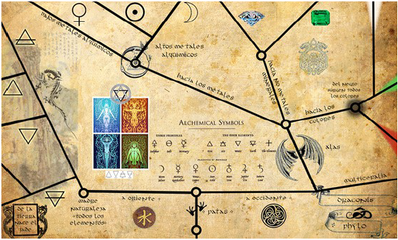 El objetivo de la actividad es que los alumnos reconstruyan la historia evolutiva de los dragones. Para ello deberán colocar sobre la lámina (Fig. 2) los 21 dragones en el lugar que corresponda, según las particularidades que observen en las imágenes que se les presentarán y su correlación con las características que van modificándose en la historia evolutiva de éstos. Las ubicaciones posibles se encuentran restringidas al final de cada rama en el margen de la lámina (Fig. 2) y a los círculos internos que representan algunos de los ancestros hipotéticos. Nótese que no todos los nodos internos tienen círculo. El docente deberá hacer hincapié en que cualquier bifurcación denota un ancestro común hipotético, exista o no carta para ubicar en dicho lugar (Fig. 2). El diseño de la lámina prioriza la simbología sobre el lenguaje escrito, dado que fue concebido con el objetivo del aprendizaje a través de alegorías (tratadas como pequeños textos con algo de misterio) y símbolos convencionales de la alquimia. Tanto la plasticidad de la imagen frente a la escritura como lo alegórico permiten al alumno una interpretación más libre y una asociación a lo lúdico (Fig. 2)