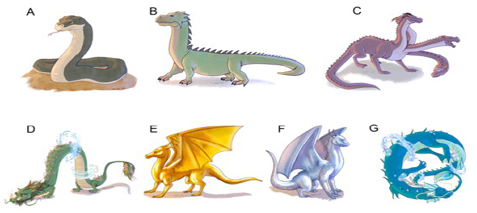 Guía para el docente: El docente repartirá las 21 figuras de los dragones para que los alumnos observen y discutan posibles agrupamientos sobre la base de sus características morfológicas. Dado que las alas surgen en una rama que incluye a todos los dragones occidentales excepto a la Hidra, se sugiere como primer paso separar los dragones alados (exclusivamente occidentales, e.g. Fig. 3E, F) de los no alados (e.g. Fig. 3A, B, C, D, G). Entre los dragones sin alas, encontramos las típicas formas orientales y algunas que resultarán difíciles de clasificar, entre ellas los ancestros anteriores a la divergencia Oriental-Occidental y la Hidra (Fig. 3 A, B, C).