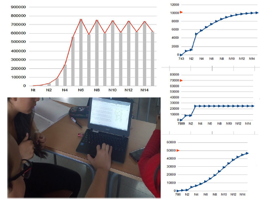 El tercer objetivo parcial (orientado a incluir eventos de predación) fue algo más complejo, pues requirió un acompañamiento más cercano y un análisis sobre el concepto de “coeficiente” matemático. Después de una discusión de estrategias, el alumnado optó por incorporar en las fórmulas logísticas coeficientes propios de las fórmulas de Lotka-Volterra (γ y δ) modificando con ellos las tasas de crecimiento de presas (r) y la capacidad de carga de depredadores (K), consiguiendo incluso en algún caso efectos cíclicos parecidos a los del modelo de Lotka-Volterra y desarrollando la concepción que distintos elementos pueden modificar los valores de r y K, como idea de interdependencia en los ecosistemas. En la conversación se puso de manifiesto que muchos alumnos consideraban sinónimos el término coeficiente y el concepto de constante física (como constante de fricción, o constante gravitacional) y se discutieron dos ideas importantes: por un lado el hecho que aunque muchas constantes son coeficientes, podemos incluir coeficientes en fórmulas que no deriven de leyes físicas preexistentes como herramienta modelizadora, y por el otro que podemos “crear” funciones incorporando coeficientes o modificando funciones preexistentes. Algunos equipos presenciaron eventos de extinción en su simulador y -aunque no se les encomendó específicamente para hacerlo- reajustaron parámetros iniciales de sus simuladores (valores de N, r, K, γ o δ) con el objetivo de estabilizar sus poblaciones hacia un equilibrio, lo que supuso de nuevo una discusión sobre los conceptos de estabilidad, sucesión y equilibrio de un ecosistema.