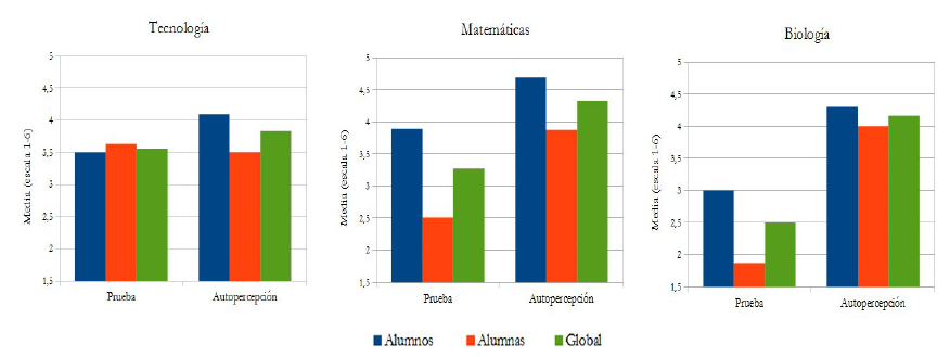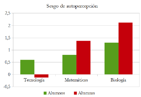 La comparación de las medias de pruebas y autopercepción indica también que el alumnado en general sobreestima sus capacidades en todas las áreas, en especial la Biología. Aunque las medias comparadas por sexos parecen apoyar el sesgo de género en la autopercepción descrito en la bibliografía (UNESCO 2017, Couso 2017) y en trabajos anteriores (Domènech-Casal 2019c), del análisis estadístico de los datos no se extrae que esas diferencias sean significativas, con excepción de los resultados obtenidos en la prueba de matemáticas. Esto quizás se deba al poco tamaño de la muestra y la falta de fiabilidad de los instrumentos.