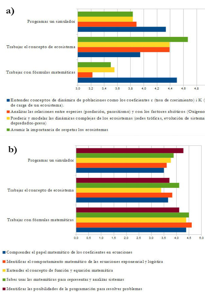 En la encuesta de valoración, los alumnos valoraron de forma muy positiva la interdisciplinariedad: de forma general consideraron que las tres acciones habían resultado útiles en todas las habilidades (valoración en todos los casos por encima de 3,2 de media, independientemente de la área de cada habilidad) (Fig. 5). Con algunos matices. Para el desarrollo del conjunto de habilidades científicas (Biología) (Fig. 5a) el alumnado ha valorado más el trabajo explícito sobre el concepto y en menor grado el trabajo matemático, excepto en lo referente a la comprensión del papel de parámetros ecológicos como r, o K, un aprendizaje que parece haberse beneficiado mucho de las aportaciones de Matemáticas y Tecnología (Trabajar fórmulas matemáticas y Programar un simulador) y aparece como el aprendizaje más interdisciplinar con diferencia (acumula 12,8 puntos de las distintas acciones).