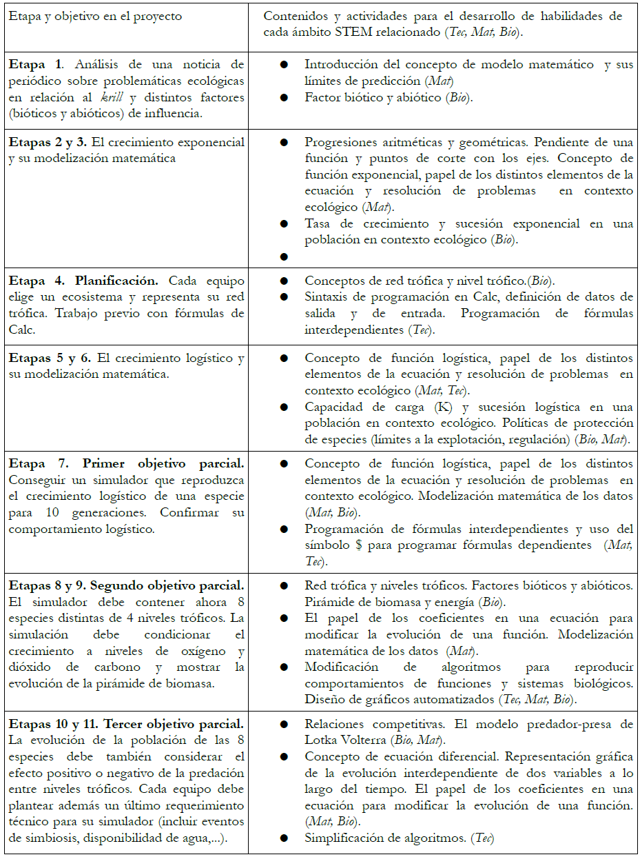 Se diseñó una actividad STEM ABP en la que el propósito (elaborar un producto) es construir un simulador de ecosistemas mediante el programa informático de Hoja de Cálculo Calc. Se escogió ese programa por sus posibilidades en la programación e interrelación de fórmulas y algoritmos, ser software libre y por ser un programa que el alumnado podría utilizar de nuevo fácilmente con otros propósitos con posterioridad a sus estudios. La actividad, diseñada para 4º de ESO, trabaja conceptos de Ciencias (dinámicas de ecosistemas, redes tróficas, pirámides de biomasa,...), Matemáticas (funciones matemáticas, exponencial y logística, coeficientes...) y Tecnología (algoritmos, interrelación de datos de entrada y salida, secuenciación,...) y tiene como objetivo el desarrollo de habilidades para cada disciplina, que incluyen las siguientes: Programar algoritmos para el cálculo de parámetros a partir de distintas variables en Tecnología (Tec); Asociar dinámicas a funciones matemáticas para Matemáticas (Mat); Realizar predicciones del comportamiento de redes tróficas para Biología (Bio). La actividad ha sido aplicada en distintos cursos académicos e institutos (desde 2013 hasta 2019) y los materiales están disponibles para su descarga, en formato web en inglés (https://sites.google.com/a/xtec.cat/cbes/) y en formato dossier del alumno/a en catalán (https://bit.ly/2xYGo6P). Los alumnos reciben el encargo de desarrollar el simulador, y en equipos de 3 participantes siguen distintas etapas de desarrollo parcial del producto siguiendo las recomendaciones descritas en la introducción de progresar a modelos paulatinamente más complejos en el marco de una situación problematizada. A lo largo de las distintas etapas se distribuyen sesiones de introducción de contenidos, de práctica en la resolución de problemas de dinámica de poblaciones y desarrollo de habilidades, y se incorpora entre cada etapa y la siguiente un espacio de resolución de dudas y discusión en gran grupo. Para la programación del simulador, el alumnado usa las fórmulas de hoja de cálculo para, en función de unas celdas de referencia con distintos parámetros ecológicos (N, r, K...), obtener datos de salida para distintas generaciones y representarlos mediante gráficos lineales y de barras. Distintos objetivos parciales del proyecto promueven el desarrollo de versiones sucesivamente más sofisticadas del simulador mediante interación. Las distintas etapas de la actividad y los objetivos de aprendizaje se describen en la Tabla 1.