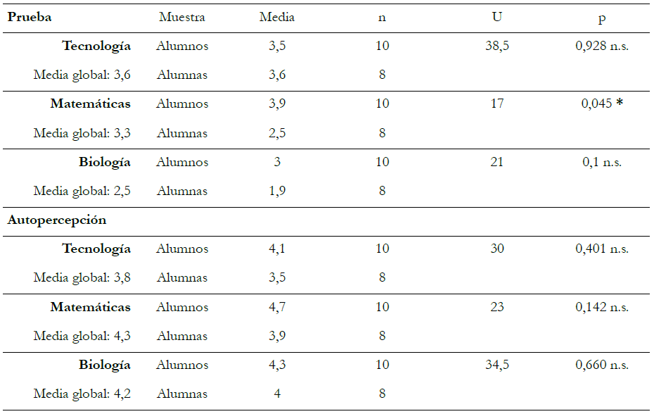 No obstante, al analizar con más precisión las posibles diferencias que sugerían las medias separadas por sexos, los resultados del test U Mann Whithney (Tabla 2) indican que las diferencias entre grupos separados por sexos no son significativas, exceptuando los resultados algo más bajos de la habilidad Matemática que obtienen las alumnas en la prueba. Del mismo modo, las distintas medias en relación a la autopercepción no resultan en diferencias significativas entre grupos por sexos.