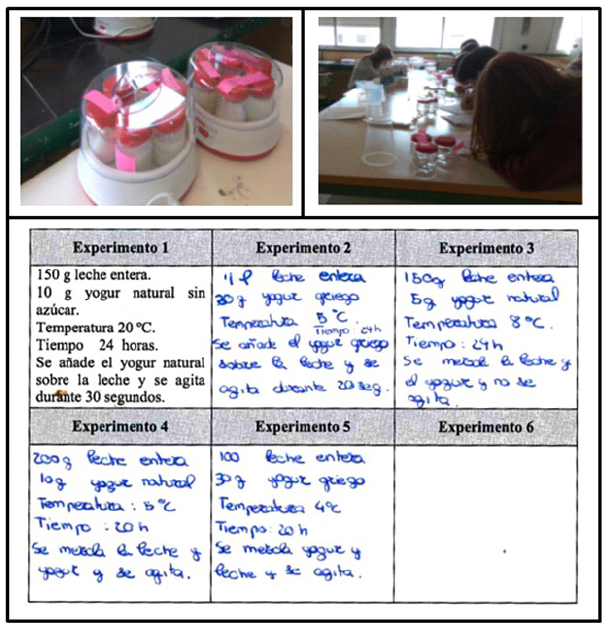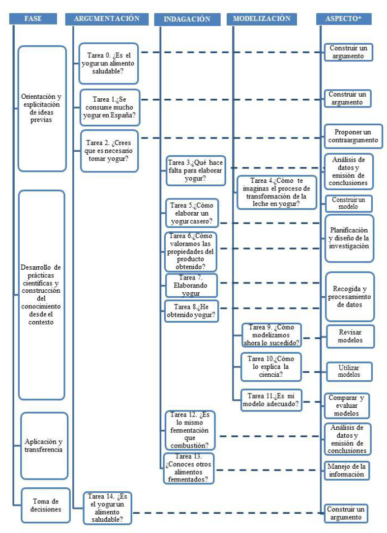 El uso de la indagación en esta SEA ofrece oportunidades para diseñar y elaborar yogur en el aula y comprender de primera mano cómo tiene lugar el proceso, dando respuesta a las siguientes preguntas ¿cómo elaborar un yogur casero? y ¿qué factores se deben tener en cuenta para hacerlo? Las tareas involucradas en la indagación requerían que los estudiantes manejen información, planifiquen y diseñen la investigación, recojan y analicen datos, emitan conclusiones y comuniquen resultados (Franco-Mariscal 2015).