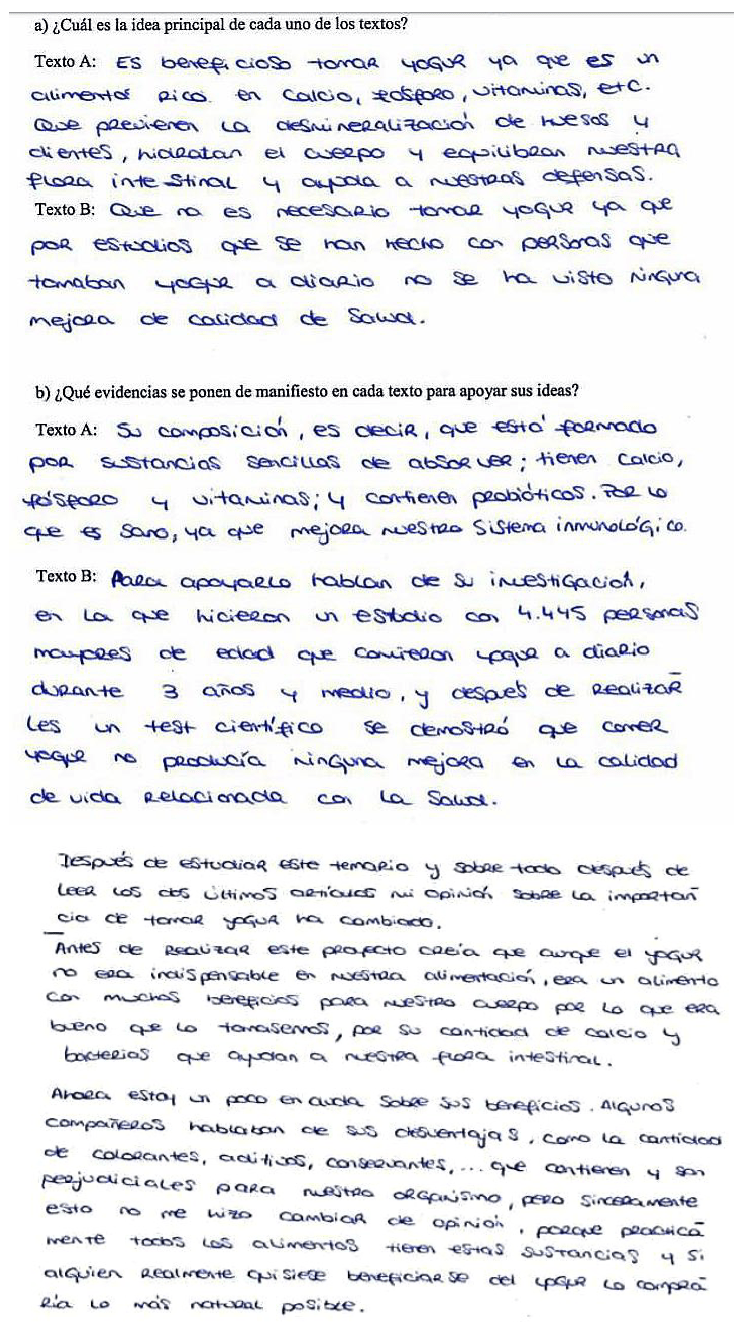 Una tarea de argumentación (Tarea 14, Figura 2) planteó el interrogante ¿es el yogur un alimento saludable? Consistió en que los alumnos leyeran y debatieran sobre el contenido de dos artículos[1] con información contradictoria sobre el yogur como alimento saludable. A partir de su lectura, debían extraer la idea principal de cada texto, las evidencias que aportan para apoyar sus ideas, y, argumentar si es o no necesario tomar yogur.