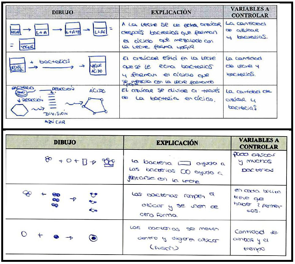 Un ejemplo de actividad de modelización es la tarea 4, ¿cómo te imaginas el proceso de transformación de la leche en yogur?, en la que debían proponer un modelo sobre cómo se imaginaban que las bacterias transforman el azúcar de la leche en ácido. El modelo debía incluir un dibujo y una explicación. Una vez propuesto, se pidió justificar las variables que se debían controlar en la elaboración de yogur. Finalmente, se realizó una puesta en común para establecer opiniones y diferencias entre los distintos modelos propuestos (Figura 4).