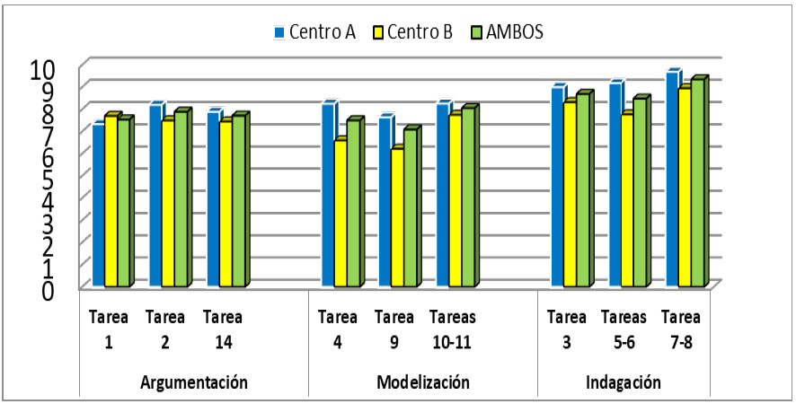 A partir de las puntuaciones de las tareas asociadas a cada práctica científica se realizó un valor medio (Figura 6). Como se observa, a pesar de que las tres prácticas reciben buenas calificaciones, no todas son igualmente valoradas. Así, la indagación fue la mejor valorada en todos los casos, con una media de 8.84 puntos, que en el grupo A llegó a superar la calificación de 9 (9.29). A continuación, le siguió la argumentación (7.71 puntos), siendo la modelización la práctica peor valorada (7.55 puntos).
