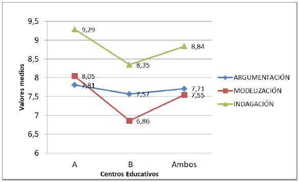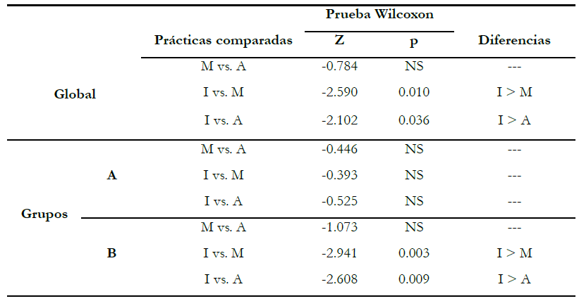 En el análisis de las diferencias entre las valoraciones (global y por centro) otorgadas a cada práctica científica (Tabla 4) se detectaron diferencias significativas a favor de las tareas de indagación frente a las de argumentación y modelización respectivamente, para la muestra global y para el grupo B.