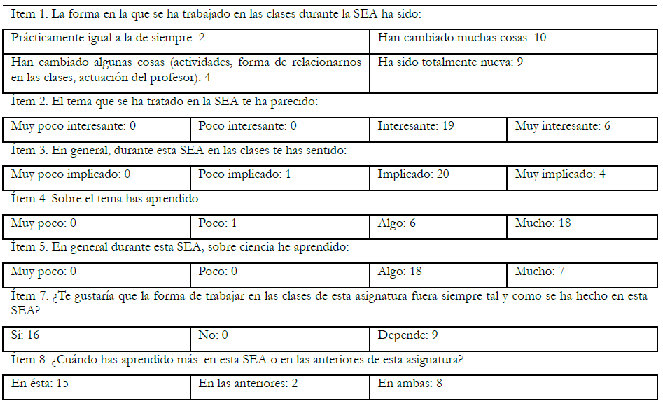 El análisis de las respuestas reveló que la mayoría de los estudiantes valoraron la metodología de la SEA como totalmente nueva porque habían cambiado muchas cosas (ítem 1) (20/25 estudiantes), encontrándola todos interesante o muy interesante (ítem 2), expresándolo de esta forma: