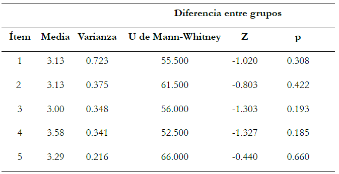 Se han estudiado posibles diferencias estadísticamente significativas entre grupos (A y B) (Tabla 2) de las valoraciones numéricas dadas a los ítems 1, 2, 3, 4 y 5, del instrumento 2 formulados mediante escala Likert con 4 niveles.