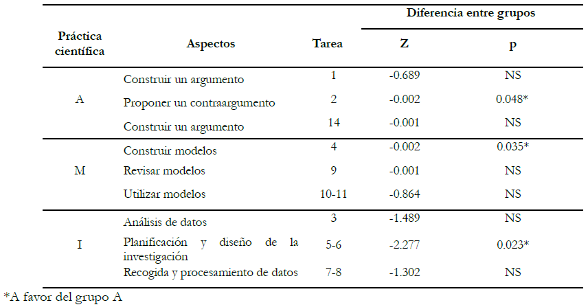 El análisis de la comparación entre grupos de las valoraciones que hacen los estudiantes de cada uno de los aspectos de las prácticas científicas (Tabla 3) muestran diferencias estadísticamente significativas entre grupos, a favor del grupo A que valoró mejor las tareas 2 (proponer un contraargumento), 4 (construir modelos), 5 y 6 (planificación y diseño de la investigación).