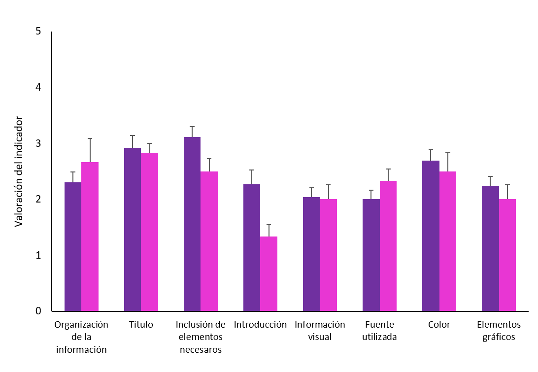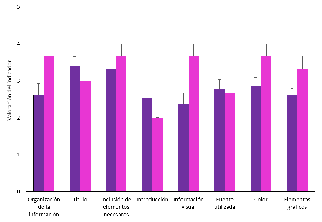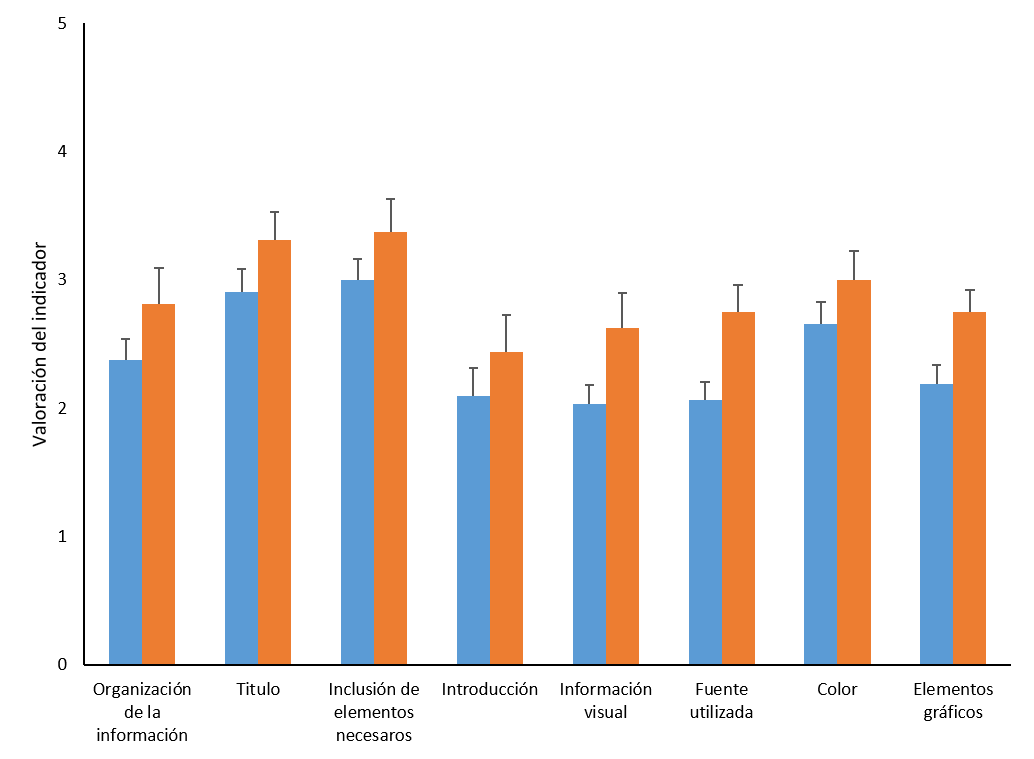 Según Berbey-Álvarez et al. (2017), los elementos gráficos presentes en los pósteres para exponer los resultados de una investigación, bien por medio de tablas o gráficas, son fundamentales para facilitar la comprensión y la retención del contenido y, por tanto, los resultados que se quieren comunicar de la investigación. Este aspecto parece que ha sido percibido positivamente por parte del alumnado, pues ha sido uno de los contenidos que se ha mejorado tras el desarrollo del T.PC.