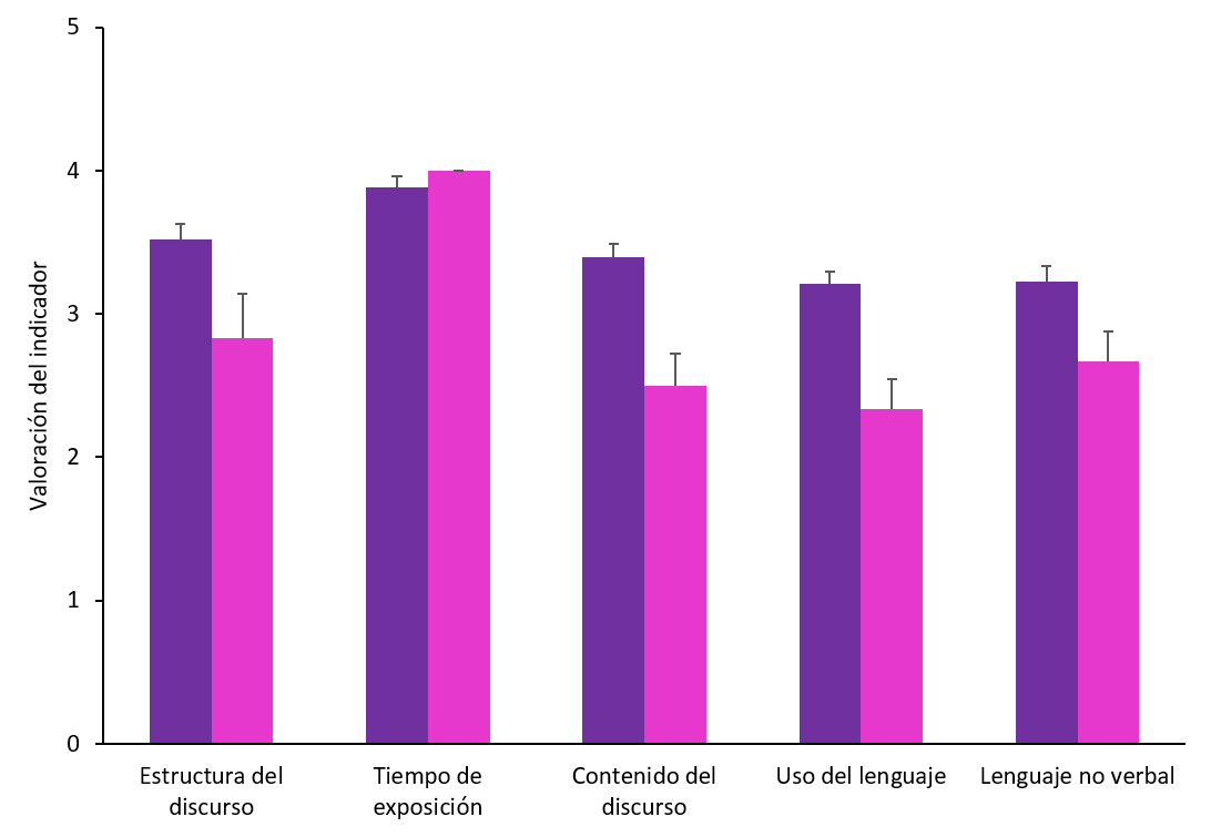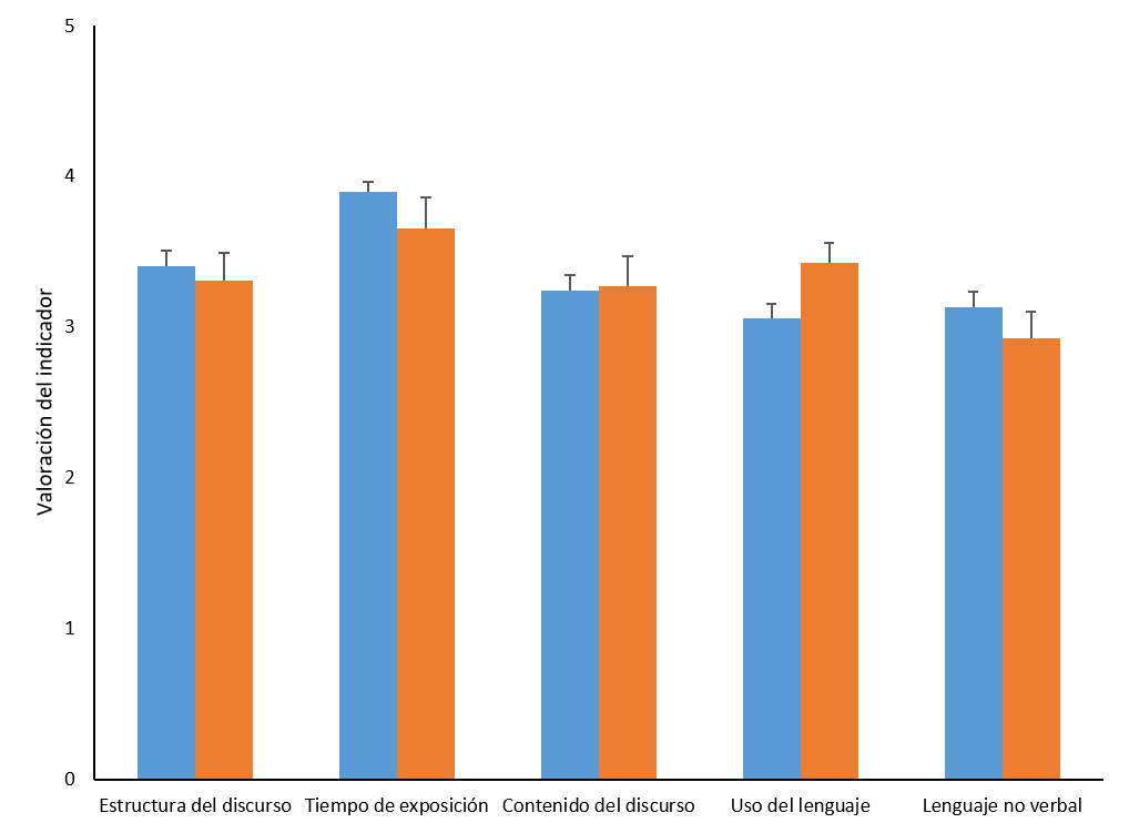 A priori no parece que el aprendizaje de ambas habilidades vaya en consonancia, o que adquirir unas ayuden a la consecución de las otras, y viceversa. Según los resultados obtenidos, no existe una correlación entre la habilidad comunicativa escrita mediante la elaboración de póster científico y la habilidad comunicativa oral, mediante su defensa (p=0,882; correlación de Spearman). Sin embargo, cuando entramos a correlacionar de manera pormenorizada los aspectos relacionados con ambas habilidades (Tablas 4 y 5), se observa una relación entre el uso de los elementos gráficos (habilidad comunicativa escrita) y el uso del lenguaje verbal (habilidad comunicativa oral).