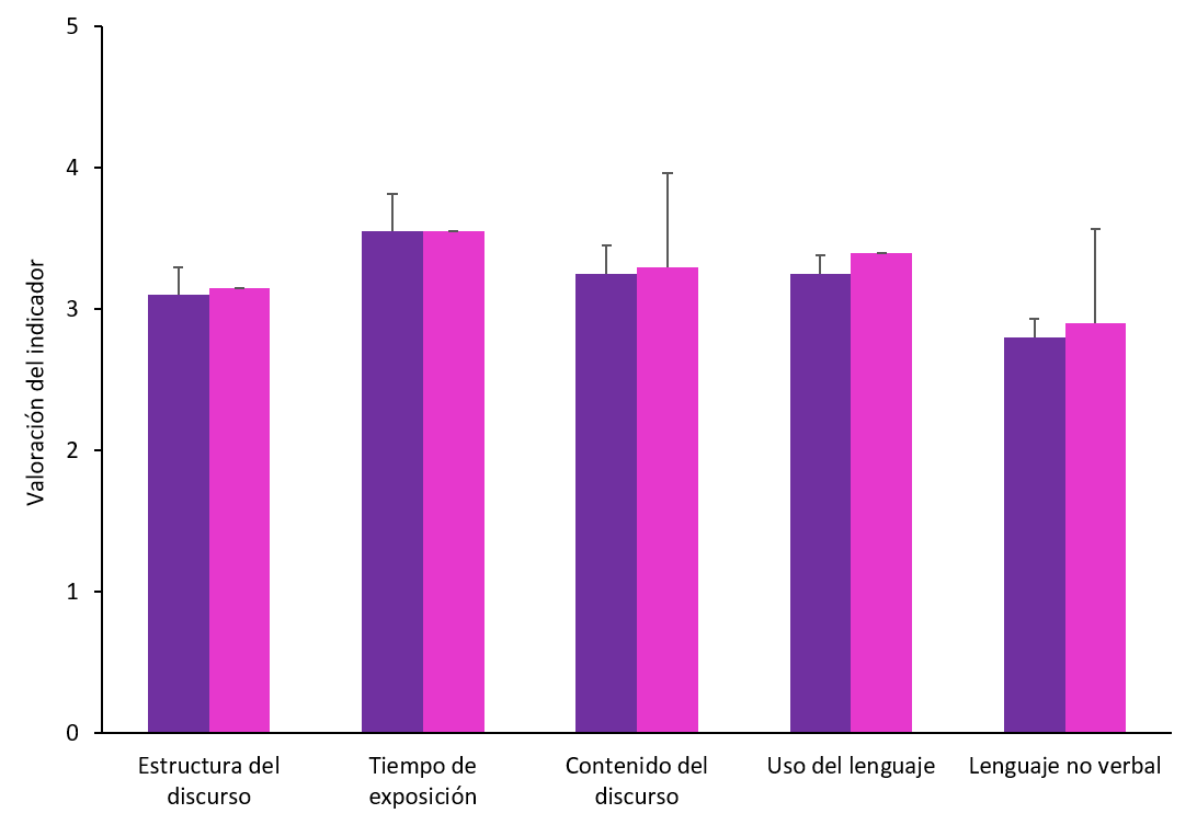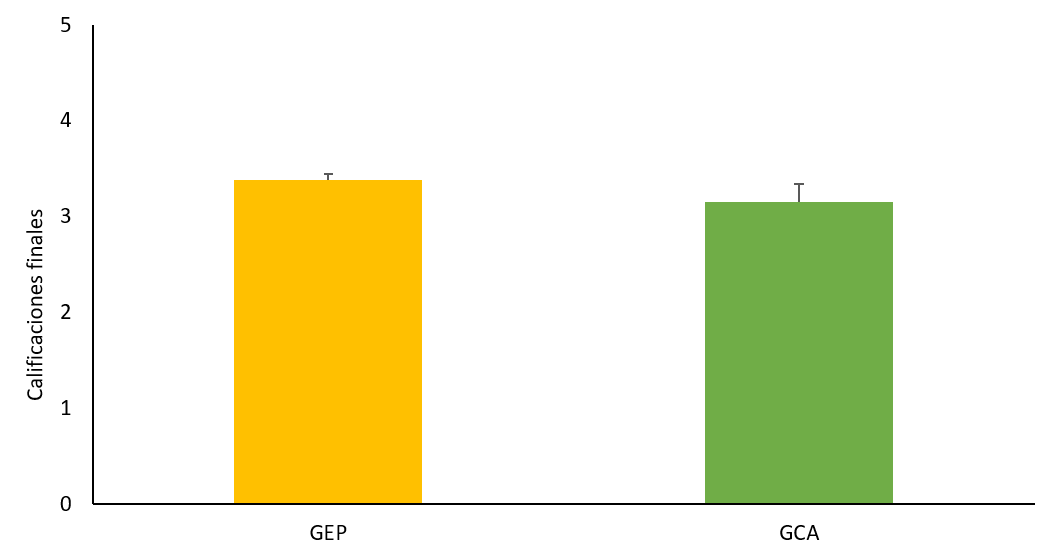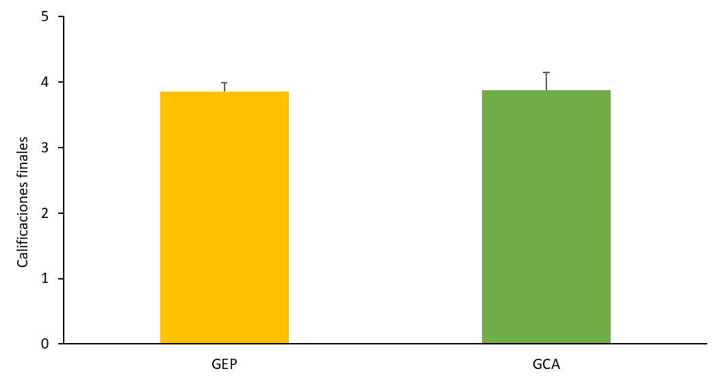 En las figuras 3a y 3b se muestra las medias de las calificaciones obtenidas por los estudiantes de los GEP y GCA en las habilidades comunicativas orales y escritas, respectivamente. El análisis de los datos mostró que no existen diferencias estadísticamente significativas en las calificaciones obtenidas en las habilidades de comunicación escrita por los estudiantes (p=0,66), ni en el caso de las habilidades orales (p=0,22). En el caso de las habilidades comunicativas escritas, asociadas a la elaboración de un póster científico, los valores medios obtenidos fueron en ambos grados muy similares. No obstante, aunque no existen diferencias significativas en cuanto a las calificaciones finales obtenidas en las habilidades comunicativas orales, se observa que los estudiantes del GEP obtuvieron una mejor calificación.