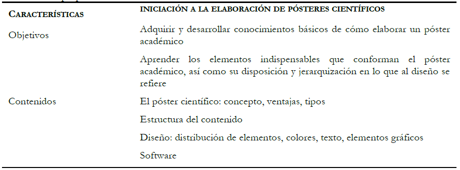Este fue impartido por personal técnico de la biblioteca de la UCA. Se ofertó dentro de los programas formativos de la categoría de “Creación, gestión y comunicación de la información”. Los objetivos de este taller, así como los contenidos tratados se muestran en la tabla 1.
