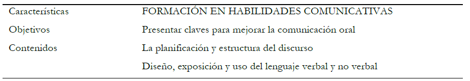 El taller de “formación en habilidades comunicativas” fue impartido por un experto en Coaching, responsable de varios cursos de formación relacionados con la comunicación y dirigidos al profesorado de la UCA. El objetivo y contenidos de este taller se exponen en la tabla 2. El taller tuvo una duración de cinco horas, con un carácter eminentemente práctico en el que se fomentó la participación de los alumnos para hacerles superar sus reticencias a hablar en público y remarcar la importancia que tiene la comunicación para ellos y para su futura labor como docentes y futuros profesionales (Tabla 2). Se organizaron dos sesiones para este taller, el 10 y 17 de diciembre en horario extraescolar de 16:00 a 21:00 horas, y al igual que en el taller de elaboración de póster científicos, los alumnos podían elegir libremente a qué sesión querían asistir. En este taller participaron un total de 36 estudiantes, 26 del GEP y 10 del GCA.