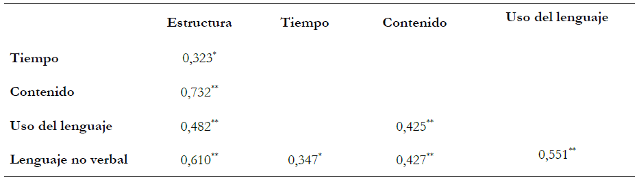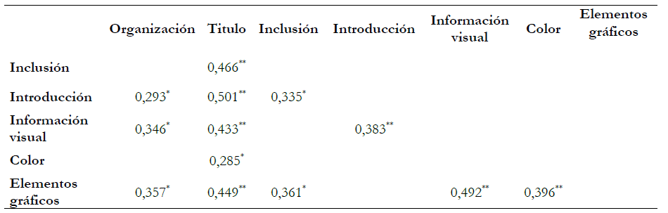 Además, se aprecia cómo determinados aspectos de la habilidad concreta, escrita u oral, sí establecen correlación con otros de la misma de manera que, al parecer, evolucionan de forma paralela. Para la habilidad comunicativa escrita, sería el caso de aquellos equipos que demuestran una mayor capacidad para organizar bien la información, son capaces al mismo tiempo de realizar una introducción adecuada y usar de forma conveniente los elementos gráficos (Tabla 4).