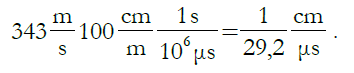 La velocidad del sonido (en condiciones de temperatura 20 ºC, al 50 % de humedad y a presión atmosférica a nivel del mar) es de 343 m/s. Se transforman las unidades para calcular el tiempo que tarda el sonido en recorrer 1 cm, dando como resultado