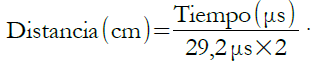 Como resultado, el sonido tarda 29,2 microsegundos en recorrer un centímetro. Por tanto, se puede obtener la distancia en cm, a partir del tiempo entre la emisión y recepción del pulso mediante la siguiente ecuación: