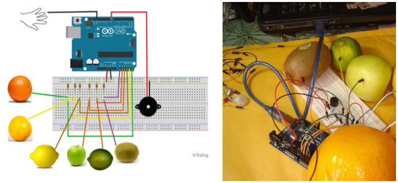 El divisor de tensión, que está formado por una resistencia de 1 MΩ y la resistencia propia de cada fruta, es alimentado a través de la placa de Arduino. El voltaje obtenido a la salida del divisor de tensión es enviado a una entrada analógica de Arduino. Al cerrar el circuito, se produce una diferencia de potencial en los bornes de las resistencias obteniendo de esta manera una tensión menor a los 5 V iniciales en función de la resistencia que oponga cada fruta debido a su acidez. Dependiendo de este nivel de tensión, Arduino envía la señal al buzzer produciendo una nota diferente en cada fruta.