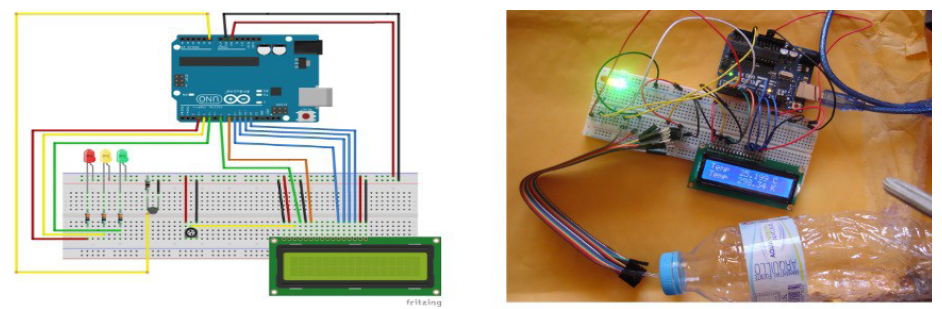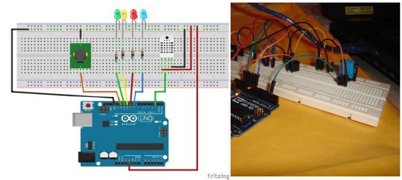 Una vez conocidos los parámetros a los cuales debe estar el ambiente para que se conserve mejor la fruta y la verdura, es decir, la humedad y la temperatura del espacio de almacenaje, se codifica en el código de Arduino. Si la temperatura y la humedad están en los valores correctos, se encenderá el led verde. Si la temperatura se mantiene en el nivel, pero la humedad no se encuentra dentro del rango de conservación de los alimentos se iluminará el led azul. Si, por el contrario, la humedad se encuentra en el rango adecuado pero la temperatura no, se encenderá el led amarillo. Por último, si ambos parámetros están fuera de los rangos óptimos, se iluminará el led rojo y, además, sonará una sirena para advertir tanto acústica como visualmente.