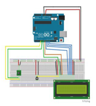 Una vez planteado el problema, se realiza una lluvia de ideas de la principal causa, formulando entre todos la hipótesis de trabajo: aparte de la temperatura y del tiempo, que juegan un papel muy importante de forma conjunta, hay otros factores destacados, como la humedad, la cual si está por debajo de la recomendada, favorece la desecación y pérdida de peso excesiva en las frutas y verduras, y si está por encima, el riesgo de contaminación por moho aumenta. El esquema de montaje para la realizar la práctica y el montaje real se muestran en la figura 6. Se propone el uso del sensor DHT11 a utilizar en la placa de Arduino para monitorizar tanto la humedad relativa como la temperatura (figura 7).