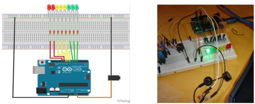Los alumnos realizan un vúmetro, dispositivo que indica el nivel de volumen en un aparato de audio. Por medio de la tabla 3 tienen que ejercitar el diseño de un vúmetro con ocho leds, que indicarán el nivel de presión sonora. Los tres primeros niveles se indican con leds de color verde, los tres siguientes con leds amarillos y, el resto, con leds rojos.