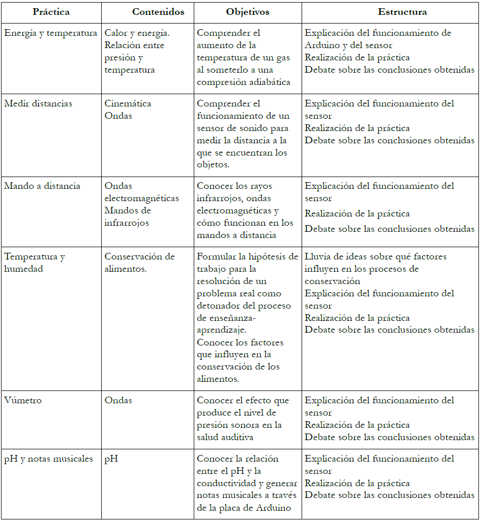 En la tabla 1 se presentan los contenidos y objetivos a tratar, así como la estructura seguida en cada una de las prácticas.