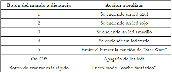 En primer lugar, hay que conocer el código asignado a cada uno de los botones del mando a distancia (el código en el cual envía el emisor las señales). Tras conocer el código, se le concede a cada botón una acción a realizar. Estas acciones se recogen en la tabla 2.