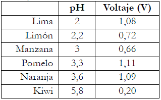 Se han elegido las frutas ácidas para observar su conductividad. Para ello, se realiza la medida de su pH y su voltaje (véase la tabla 4) observando que hay una relación inversamente proporcional, al ser la fruta más ácida, con más pH, disminuye más el voltaje por lo que se favorece la circulación de electrones y su conductividad es mayor.