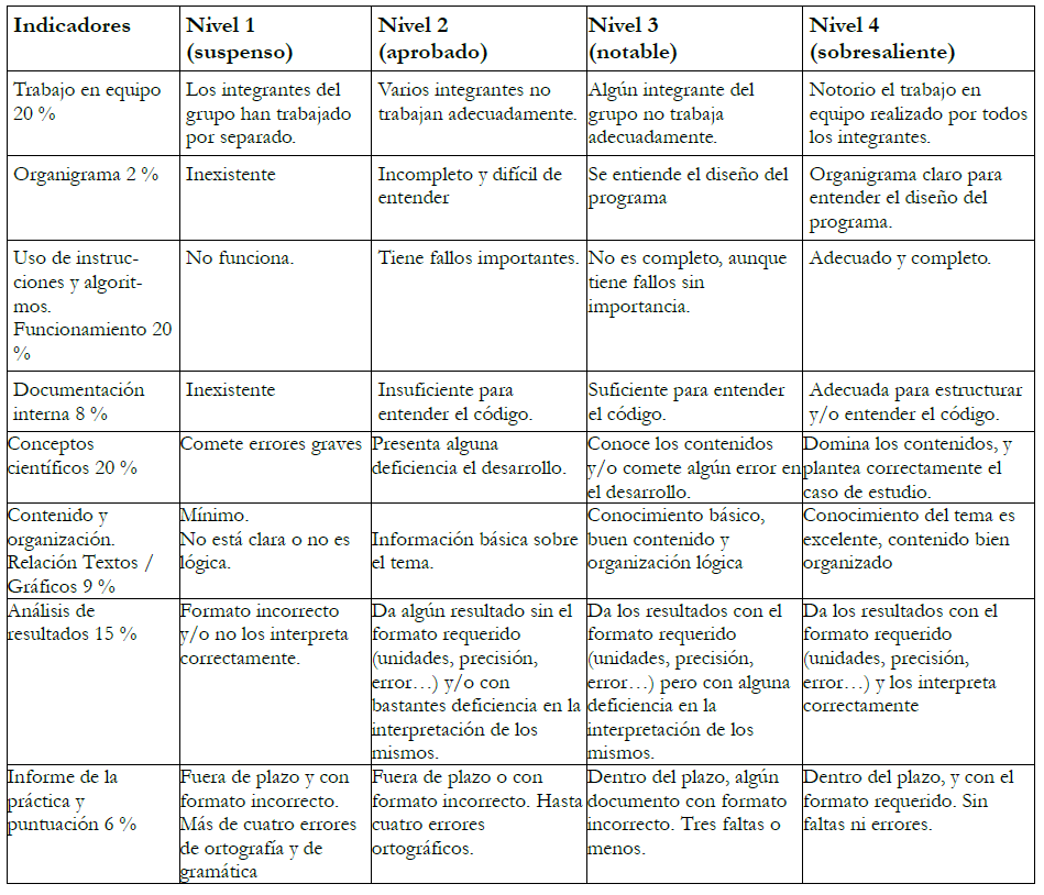 Para evaluar el desempeño de cada equipo de estudiantes al realizar las prácticas se ha elaborado una posible rúbrica (véase la tabla 5) en la que se han puntuado los indicadores de 1 a 4. Para su confección se ha tenido en cuenta las competencias que se trabajarán con el conjunto de las prácticas.