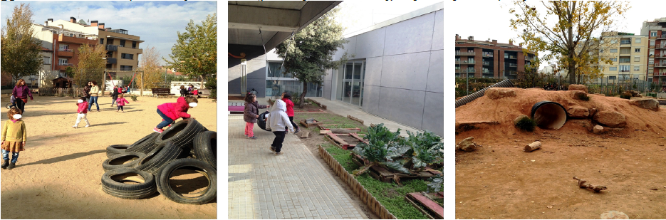 Y aunque muchos centros puedan facilitar a los niños suficiente tiempo fuera del aula, muchos patios escolares no suelen disponer de elementos naturales o su presencia es anecdótica y sin interés educativo. La tendencia viene dada por espacios dedicados al deporte y al desarrollo psicomotor o espacios manufacturados donde predominan los suelos de caucho y elementos de plástico (Carr et al. 2017). Es cierto que no todas las escuelas tienen las mismas capacidades para transformar totalmente el patio en un entorno natural, pero son cada vez más los centros que introducen paulatinamente y de manera consciente materiales no estructurados y elementos naturales en el patio tradicional (Figura 1).