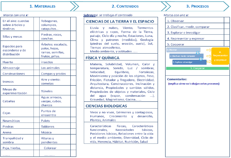 Por tanto, la conjunción de una disponibilidad de tiempo y espacios exteriores dotados de elementos atractivos, sensoriales, y preferentemente naturales, que ofrezcan oportunidades para las interacciones sociales y con el medio, junto con una adecuada orientación hacia la práctica científica, puede fomentar una apropiación mayor del contexto natural y un mejor aprendizaje de temas tan variados como la meteorología, la materia y sus transformaciones, la física o los seres vivos; realizando observaciones, predicciones, comparaciones, clasificaciones e incluso pequeñas investigaciones.