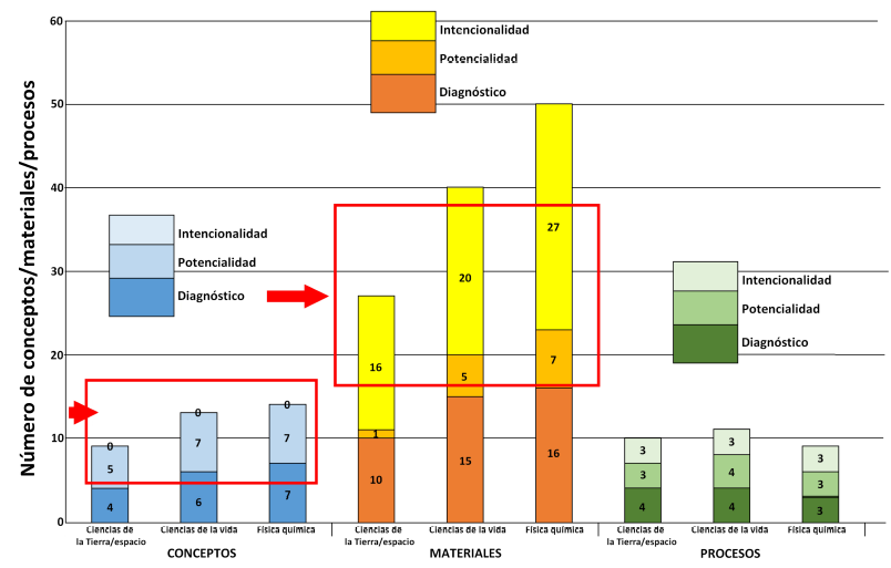 Sin embargo, y como hemos enfatizado con flechas rojas en la Figura 3, al analizar la intencionalidad de los docentes se ha podido comprobar que no dan importancia a trabajar los conceptos científicos, ya que no mencionan ninguno. Por otro lado, sí ven la necesidad incluso de introducir más materiales. No consideran relevantes los procesos científicos y por tanto no van más allá de observaciones y clasificaciones, y solo en alguna ocasión se produce alguna exploración o hacen alguna representación de lo que han trabajado mediante dibujos. Estos dos últimos procesos surgen de manera natural y no sistemática por parte del docente, por lo que podríamos decir que, a pesar de todo el material del que disponen en el aula, la orientación para trabajar con ellos es muy superficial y no hay una intencionalidad ni para trabajar conceptos ni para promover procesos por parte de los docentes.