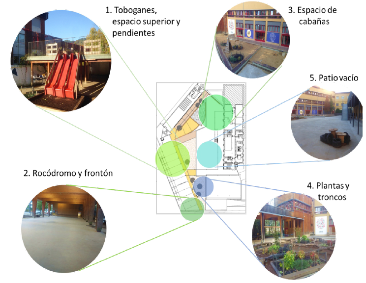 El espacio exterior se ha dividido en cinco zonas muy distintas entre sí, que se han definido en función del tipo de elementos que podemos encontrar en cada una de ellas: zona de toboganes, rocódromo, espacio de cabañas, zona de plantas y patio vacío (Figura 4). Según las escalas ECERS y SEVEN7 es un espacio de alta calidad, con muy buena conectividad y donde el niño puede situarse en el espacio muy fácilmente. Hay una presencia notable de elementos de cambio en forma de vegetación estacional y toboganes o pendientes naturales que ofrecen retos a los niños. En cualquier caso, y a pesar del esfuerzo desarrollado en la transformación el patio, este solo se utiliza en el tiempo de recreo y no con fines educativos, ya que cuando hace buen tiempo hacen uso de la terraza que dispone cada uno de los pisos superiores donde se ubican las clases.