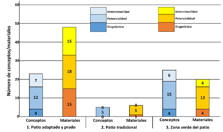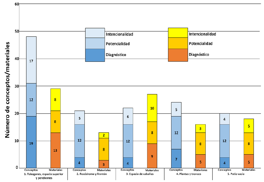 En el análisis de las diferentes zonas que componen este patio (Figura 5) podemos comprobar que hay una gran diferencia en relación a los materiales y contenidos identificados en la zona de toboganes (zona 1) con respecto al resto. En esa zona los niños abordan un buen número de conceptos físicos como la velocidad o la inclinación cuando juegan con objetos en el tobogán, pero también hacen uso de un huerto que se localiza en la estructura superior donde se acercan a conceptos como la diversidad, las necesidades básicas o el ciclo de vida de las plantas.