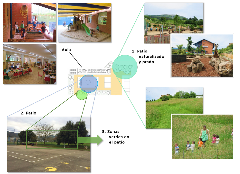 En los últimos tiempos están surgiendo ejemplos interesantes de aprendizaje al aire libre del tipo de escuelas del bosque, que representarían un ideal del medio natural como aula y contexto de aprendizaje en la naturaleza. Otras muchas escuelas aprovechan espacios verdes próximos al centro como extensión de sus actividades. Un número cada vez mayor de escuelas de infantil está realizando actuaciones para transformar y naturalizar sus patios (Castro 2017). Estos espacios podrían ser un escenario clave para el desarrollo de la competencia científica de los más pequeños. Si bien no hay muchos trabajos que hayan examinado la relación entre el aprendizaje y el diseño y uso de espacios escolares al aire libre en infantil, un patio con una mayor presencia de materiales no-estructurados y elementos naturales como agua, arena, tierra o plantas presumiblemente ofrece más oportunidades para promover la exploración informal y espontánea de la ciencia que un patio tradicional.