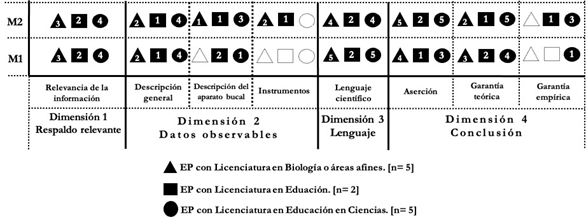La mayoría de los EP (4/5 en el M1 y 5/5 en el M2) usó lenguaje científico (LC) como un elemento recurrente en sus respuestas, haciendo evidente la familiaridad con el vocabulario científico; ya sea por su formación, o por la revisión de referentes teóricos específicos. No obstante, el uso de las palabras científicas (nombre de las especies o estructuras anatómicas) no necesariamente nos indica que para los EP estas tienen significado y sentido para apoyar la elaboración de argumentos en el contexto en que se solicitaba (Toulmin, 1972).